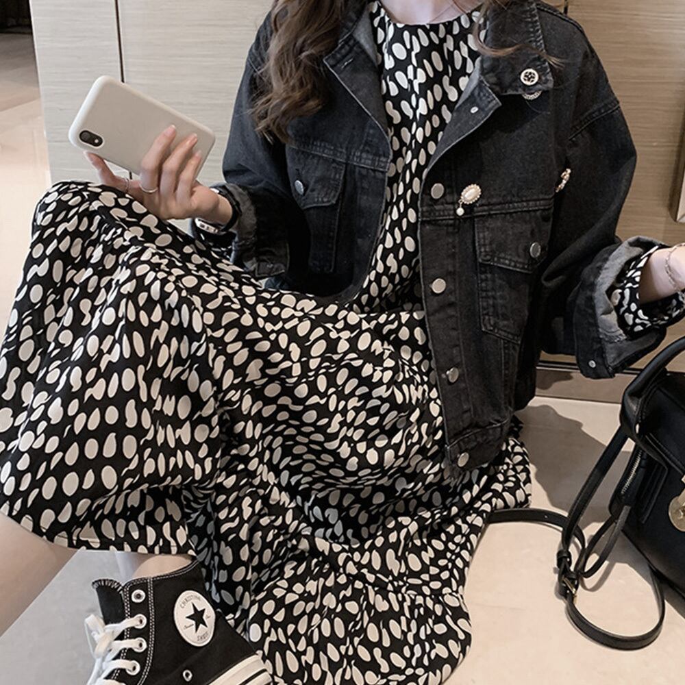 女性ならではのドット柄でフェミニンに、首の露出を抑え清楚に。絶妙なバランス1枚で素敵な着こなしに仕上げてくれます